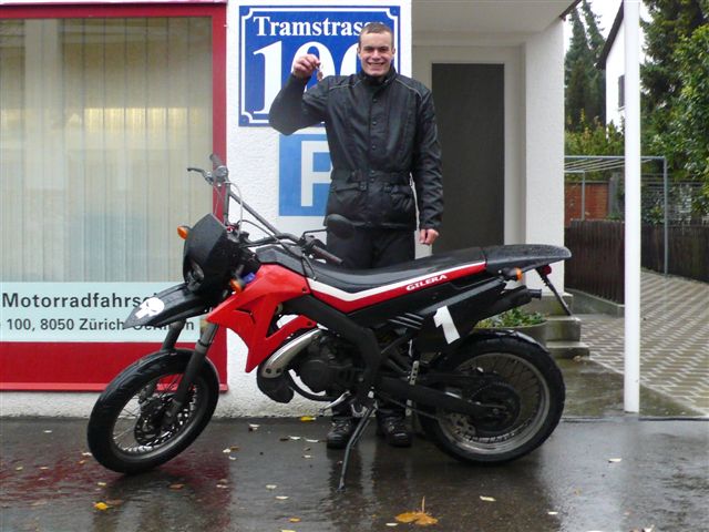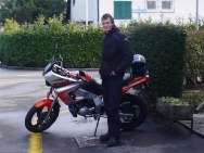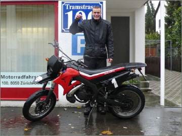 Noch an der SWISS-MOTO schwärmte er (im Bild in Begleitung seines Vaters) von einer Yamaha TDR 125, jetzt ist er heute SA, 7.März zu Besuch gekommen: Die Maschine macht ihm viel Spass und er darf sie (125 Kubik, 7 kW) ohne weitere Prüfung fahren. Die Bremsen haben ihm - wie ich ihm angekündigt habe - Respekt eingeflöst und mit Schräglagen empfahl ich ihm, sich bei den winterlichen Strassen auch noch etwas zurückzuhalten. Er hat «WOW» mächtig Freude an seinem Gefährt und einen Riesenstolz! |