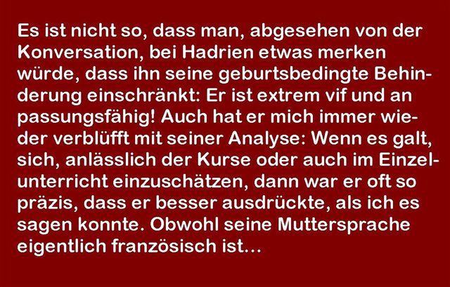 Hadrien muss, um sein Gegenüber zu verstehen, von den Lippen ablesen: Das macht er in Französisch, seiner Muttersprache, aber auch in Hochdeutsch (deshalb habe ich und meine Instruktoren alle Kurse von A-Z in Hochsprache geleitet, wenn er dabei war) und auch in Englisch. Sein Platz war deshalb immer vis-à-vis des Instruktors, bei einem Gruppengespräch und für mich hiess das im Einzelunterricht, dass er anhalten musste (wo immer es ging), ich vom Sattel rutschte und mich vor ihm über dem Vorderrad aufstellte, mit hochgeklapptem Helm.