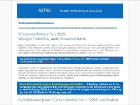 Bern, 19.03.2026 Strassenverkehrsunfälle 2025: Weniger Todesfälle, mehr Schwerverletzte Pressemitteilung als PDF [189 KB]