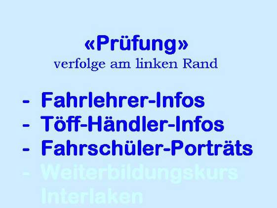 Möchtest Du Dich zu den Themen «Fahrlehrer-Infos» oder «Töff-Händler-Infos» informieren, dann folgst Du dem Link am linken Rand |