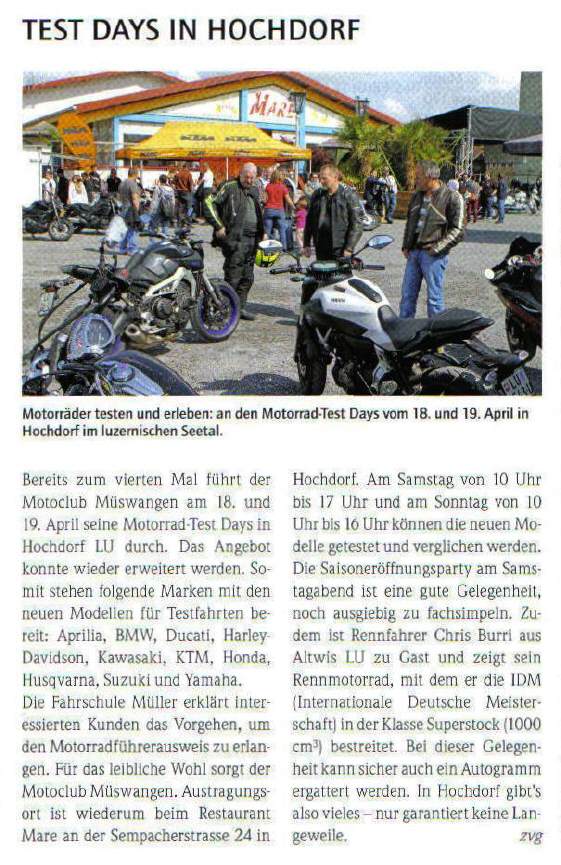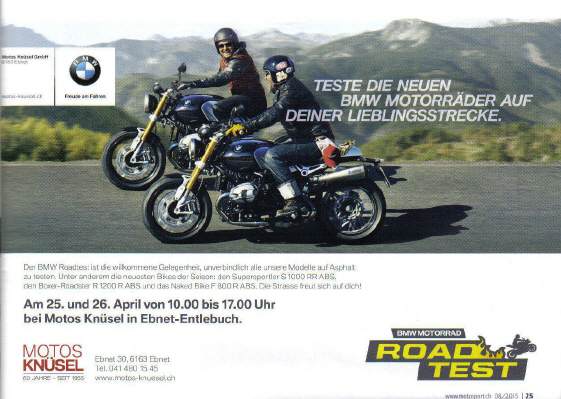 Auf dem Gelände des Flugplatzes «Speck» in Fehraltorf finden mit unserem langjährigen Sponsor «Müller+Jussel» BMW-Testtage statt. Urban Jussel hat mir als Kunde ein E-Mail gesandt, welches ich gerne weiterleite. Hier hat man die Möglichkeit verschiedene BMW-Motorräder zu testen, um sie im Umkreis auf den Landstrassen des Zürcher Oberlands zur Probe zu fahren. Viel Spass dabei! Hier landest Du direkt auf der Webseite von «Müller+Jussel» |