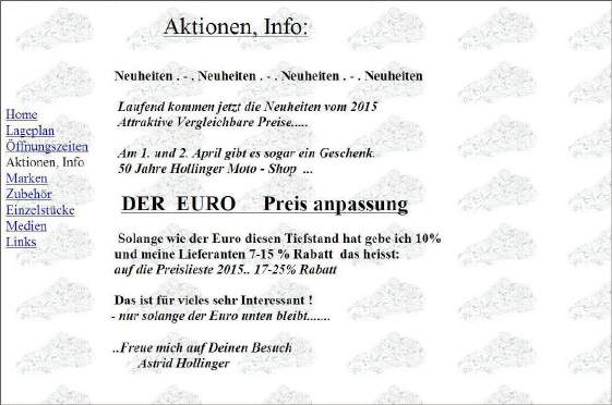 Oeffnungszeiten: mo 20.12 14.00-18.30 di 21.12 14.00-18.30 Fensterbild mit Apero 18.00-19.00 mi geschlossen do 23.12 14.00-18.30 fr 24.12 10.00- 17.00 Frohe Weihnachten Donnerstag 30. Dez Schnäppchenmärt 10.00-17.00 mit Glühwein.....und kleinen Preisen ! Ferien bis 9.Januar 2011 Moto-Shop Hollinger Bahnhofstrasse 20 8304 Wallisellen |