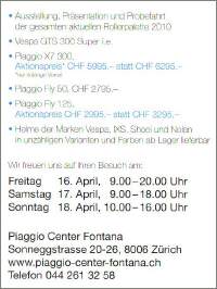 Gut erreichbar, unterhalb Triemli/Zürich, bei Scooter Planet, dem Spezialisten für Vespa und Piaggio, die neusten Roller ausprobieren und probefahren. Top aktuell in der Schweiz, steht jetzt auch die neue Vespa PX zum Testen bereit. Bei Scooter Planet ist dieser Vespa Klassiker ab sofort lieferbar. Ausserdem: - Aktion Super Leasing 2.9% auf das gesamte Roller-Sortiment bis 31.Mai 2011, Helme der Marken Vespa, Momo, Roof und Davida in unzähligen Varianten und Farben ab Lager lieferbar und grosse Auswahl an Vespa-Accessoires und Bekleidung. Scooter Planet, seit 1997 der Spezialist mit dem grössten Angebot und der vielfältigsten Auswahl für klassische und moderne Roller der Top-Marken Piaggio und Vespa, lädt ein zu Ausstellung, Präsentation und Probefahrt der aktuellen Rollerpalette 2011. Wir freuen uns auf Ihren Besuch am: Freitag 1. April, 10.00 – 18.30 Uhr, Samstag 2. April, 10.00 – 16.00 Uhr. |