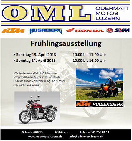 HONDA und KTM: Ja das gibt's! Und zwar in Littau-Luzern bei OML, Odermatt-Motos Luzern: Hier geht's zu seiner Seite auf meiner Homepage, klicke aufs Bild unten, um direkt auf seiner Homepage zu landen!