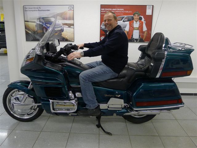 Gerry Wetter war in den letzten beiden Jahren bei mir in der Ausbildung und hat am 17.Okt. 2012 erfolgreich seine Prüfung bestanden. Da sich seine Freundin aus gesundheitlichen Gründen nicht auf seinen Honda VF750 Custom setzen kann, hat er sich nun ein bequemeres «Sofa», eine Honda GoldWing Sechszylinder zugelegt. Seine 750er ist übrigens zu verkaufen! Beides steht nun an prominenter Stelle in seinem Show-Raum. Auf dem Bild: Der sichtlich erleichterte (weil Prüfung bestanden) Gerry auf seiner stolzen Neu-Erwerbung. Die Maschine hat übrigens Beck Zimmermann gehört, bei dem ich regelmässig zum Zmittag gehe.