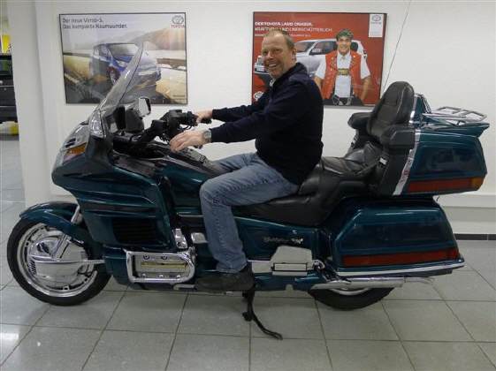 Gerry Wetter war vor 2 Jahren bei mir in der Ausbildung und hat am 17.Okt. 2012 erfolgreich seine Prüfung bestanden. Da sich seine Freundin aus gesundheitlichen Gründen nicht auf seinen Honda VF750 Custom setzen kann, hat er sich nun ein bequemeres «Sofa», eine Honda GoldWing Sechszylinder zugelegt. Sie steht nun an prominenter Stelle in seinem Show-Raum. Auf dem Bild: Der sichtlich erleichterte (weil Prüfung bestanden) Gerry auf seiner stolzen Neu-Erwerbung. Die Maschine hat übrigens Beck Zimmermann gehört, bei dem ich regelmässig zum Zmittag gehe.
