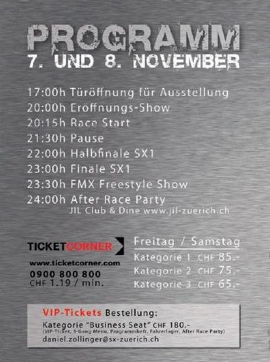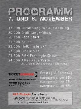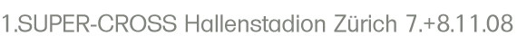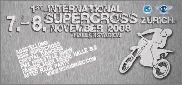 SUPERCROSS zum 1.Mal in der neuen Sportarena Hallen- stadion Zürich. Supercross be- deutet Ausdauer, Action und Spannung. Racing pur, Laser- show, Crystal Dancers, VIVIAN music, Freestyle Show sowie fulminante After Race Party lauten die Eckpunkte in dem täglich 4stündigen Programm - kein Platz für Langeweile.