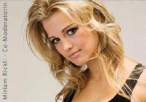 Miriam Rickli, Miss Schweiz Finalistin 07. Sie schaffte es unter die ersten 6 in der Endausscheidung der schönsten Frauen der Schweiz. Mit Können und Kreativität übernimmt sie die Moderation der MISS SUPERCROSS Club-Tour 2008. An beiden Raceabenden übernimmt sie zusammen mit Beni Wobmann das SUPERCROSS’08.