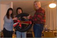 Von Rosle und Georg erhalte ich feierlich einen Hinterreifen für meinen Toeff überreicht. Die Botswanagruppe, die mit mir im Oktober 06 unterwegs war, hat ihn mir geschenkt. Danke Romi, Eveline, Iduna, Remo, Heinz und Marcello