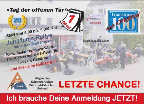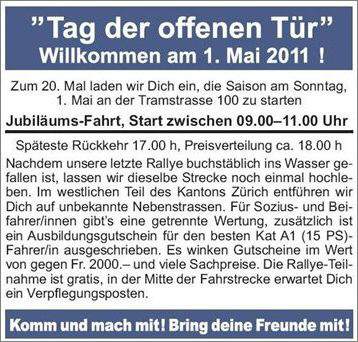 Das Rallye anlässlich des "Tages der offenen Tür" an der Tramstrasse 100 ist unentgeltlich. Die Suchfahrt führt an verschiedene Posten, den Teilnehmern wird eine Karte von der Strecke und ein Roadbook abgegeben. Gestartet wird ab 9 Uhr, letzte Möglichkeit um 11 Uhr. In der Mitte der Strecke gibt es einen Verpflegungsposten. Spätester Zeitpunkt für die Rückkehr ist 17.00 Uhr, wer später kommt wird nicht mehr gewertet. Am Abend gibt's eine Preisverteilung um 18 Uhr mit Preisen im Wert von über 2000 Franken. Anlässlich der Preisverteilung gibt es eine Fahrer- sowie eine extra-Beifahrer-Wertung. Dem besten Kat.A1-Fahrer in der Schlusswertung winkt ein Ausbildungsgutschein im Wert von Fr. 400.-. |