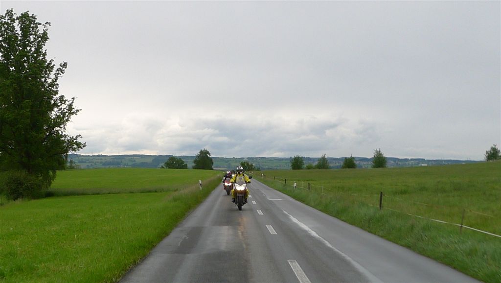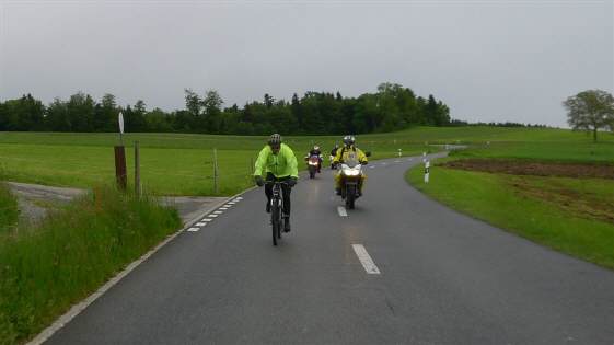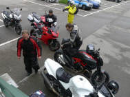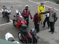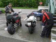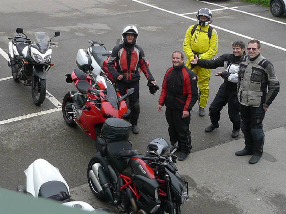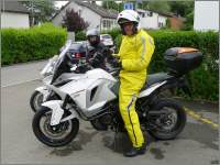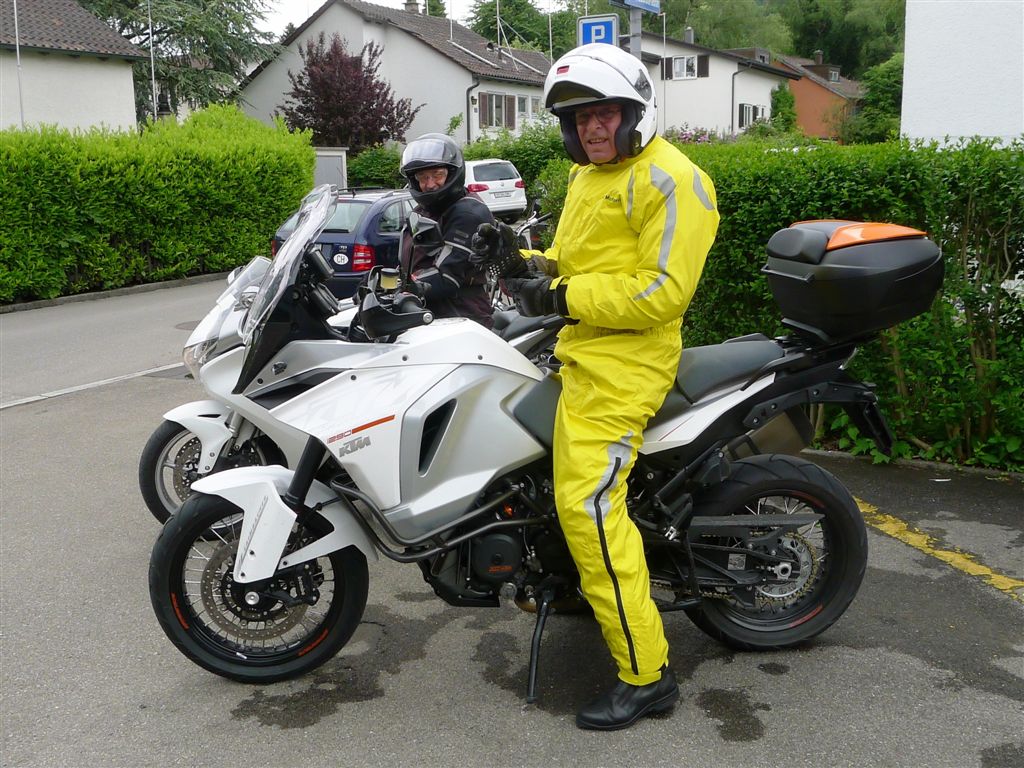 | Entgegen den Prognosen sah es um zwei Uhr gar nicht so schlecht aus: Alle hatten mit dem schlimmsten gerechnet und sich deshalb in die Regenkleider gestürzt. Arthur mit dem leuchtend gelben BMW-Regenkombi auf seiner nigel-nagelneuen KTM Adventure - womit hat die KTM das verdient? Die laubgrünen Fischerhosen von Roman mögen wohl wasserdicht sein, aber auf der eleganten Sporttourenmaschine VFR1200 beging er damit eher einen Stilbruch. |