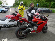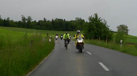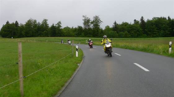 | Um 14.00 Uhr startete Arthur mit Roman an der Tramstrasse, um weitere Teilnehmer um 14.30 Uhr in der Waldegg zu treffen. Sie bildeten die erste Gruppe für die Anfahrt, die es gemütlich angingen. Wie sich später herausstellte, fuhren sie praktisch dieselbe Strecke wie wir, die um 17.00 Uhr in der Waldegg starteten.Im Bild: Arthur als «Gelbe Banane», dahinter Roman auf der Honda.