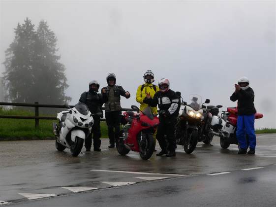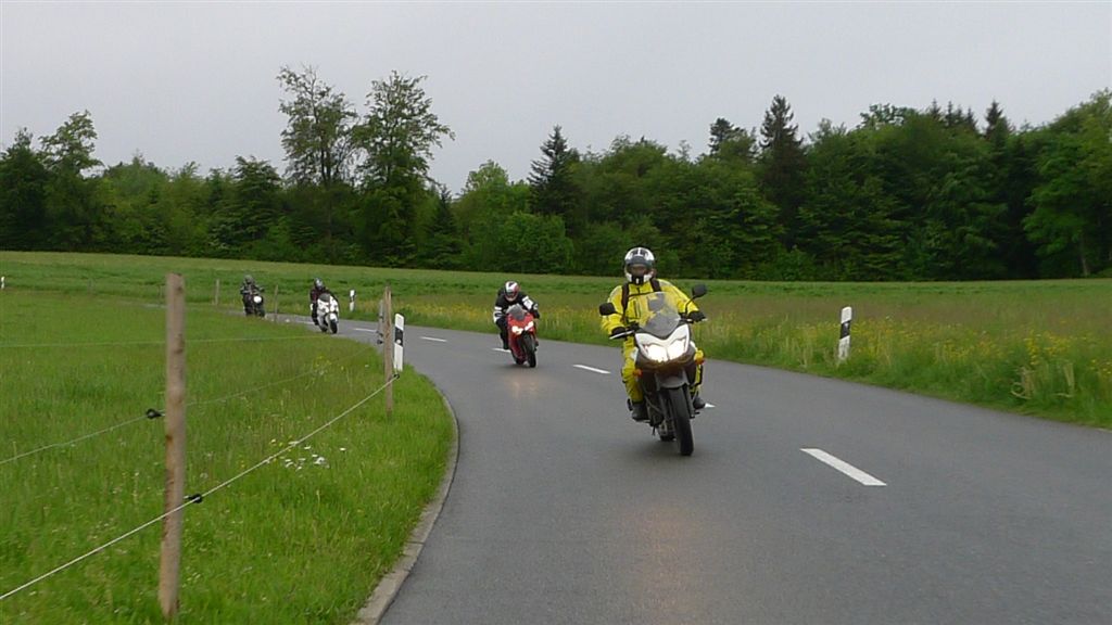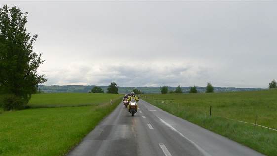 | Frank traf bereits um 16.25 Uhr an der Tramstrasse ein. Zusammen fuhren wir, um diese Zeit mit allen Tricks und Kniffs durch die Stadt zur Waldegg, wo wir kurz vor 17.00 Uhr eintrafen. Alle anderen, namentlich Remo, Dominik und Claudio erwarteten uns bereits. Kurz nach 17.00 Uhr fuhren wir los. Da ich meine Fahrbrille hatte zuhause liegen lassen, hielten wir unterwegs 2 mal ausserplanmässig an. Wegen der nassen Strassen suchte ich eine Strecke, die nicht ganz so kurvig war wie sonst. |  |  |