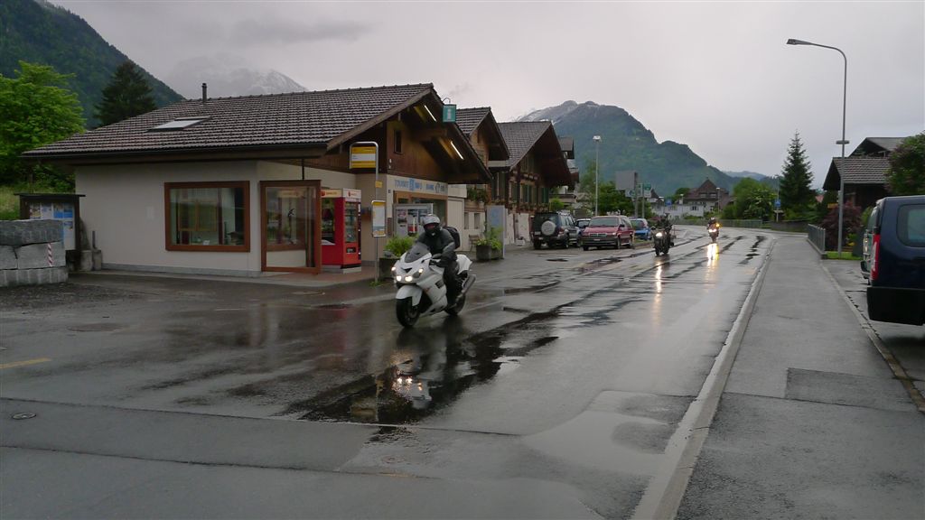 | Bei diesen Wetterverhältnissen wollten wir so früh als möglich am Ziel sein und deshalb fuhren wir bereits in Steffisburg auf die Autobahn. Aus der Autobahn wurde es nach Spiez eine Autostrasse, bevor wir in Interlaken wieder den Status einer Autobahn erhielten. Doch schon bald mussten wir sie verlassen, denn Bönigen war unser Ziel. Diejenigen mit kleinem Tank gingen noch erst tanken, während Frank und ich gleich weiterfuhren. Arthur's Gruppe hatte eine Garage erhalten, wir parkten unsere Töffs draussen neben Philipp, der über die Autobahn angefahren war: Später los und früher da, bestimmt aber mit bedeutend weniger Kurven ... |