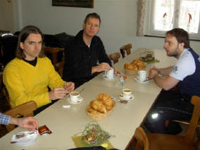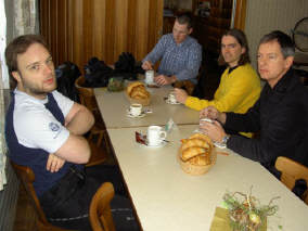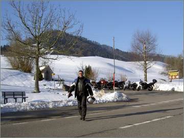 Wir treffen uns ausnahmsweise alle bei der Migrol-Tankstelle in Brüttisellen, beim Rest. Flamingo. Hier machen wir uns noch wintersicher, denn Hanspeter kommt mit den ledernen Handschuhen - und dies bei Minus-Temperaturen. Die Strassen sind trocken, aber beim Fahrtwind wirds verdammt kalt unterwegs. Über die Autobahn fahren wir nach Volketswil, dann über Fehraltorf-Turbenthal nach Bichelsee und da in den Hinterthurgau bach Fischingen-Mühlrüti. Pünktlich um 8 Uhr treffen wir am Ziel ein. |