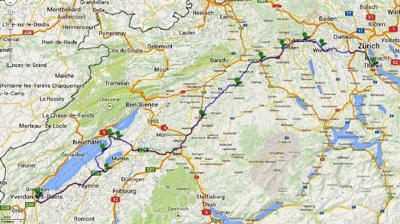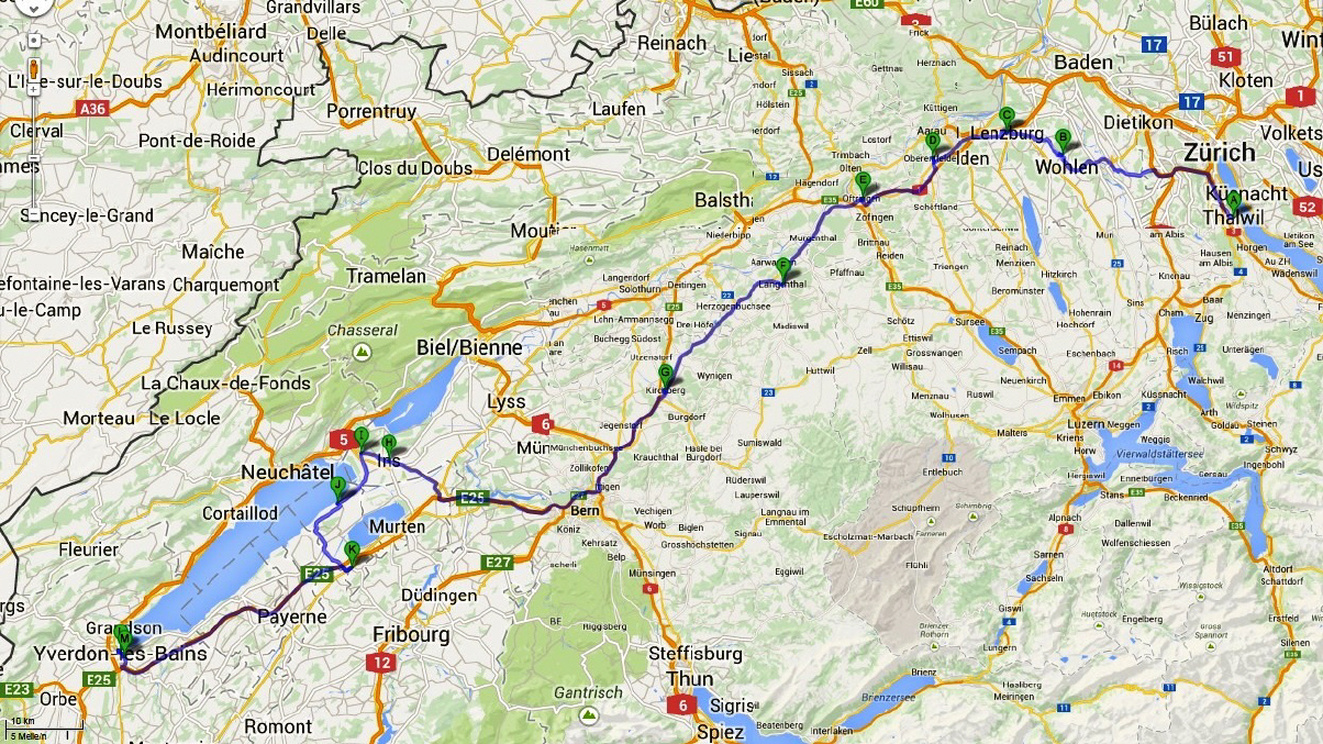 Nach der Abfahrt Kerzers gingen wir etwas verloren und wir fuhren zwischen Murten- und Neuenburger- see in Richtung Yverdon-les-Bains, wo wir übernachten wollten. Nach der Fahrt durch einen Kreisel in der