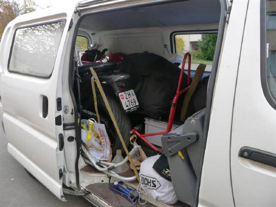 Am Sonntagabend luden wir die Motorräder und unsere Töffkleider. Neben den Töffs mussten auch noch vier Winterräder Platz finden, da wir ja nicht wissen, unter welchen Umständen wir wieder nach Hause fahren. So wurde es Montag, und, da wir auch noch die Wohnung putzen und aufräumen mussten, schliesslich Montagmittag, bis wir zu unserer weiten Fahrt aufbrechen konnten. Wir wollten langsam, ohne Benützung der Autobahnen nach Spanien fahren, um nachzuvollziehen, was das früher für die Leute bedeutete, als es noch keine Autobahnen gab.