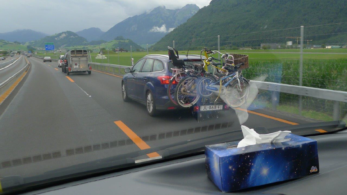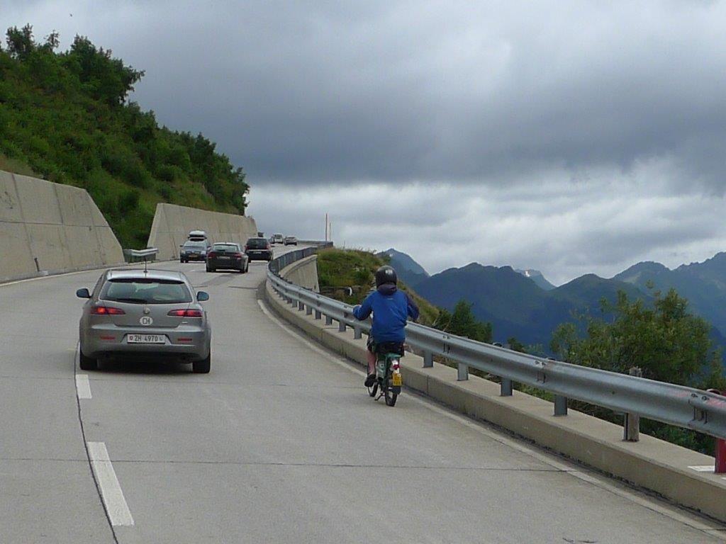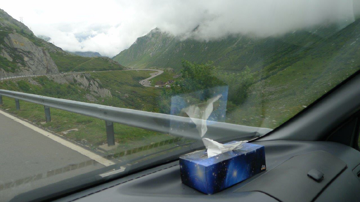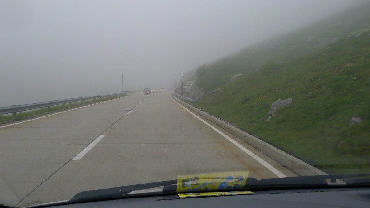 Es ist Rückreisetag für viele, so entschliessen wir uns am 7-8 Kilometer-langen Autobahn-Stau über die Normalstrasse vorbei und die Gotthard-Route zu fahren. Lieber eine Stunde mehr fahren (wenn überhaupt!) und etwas erleben, als im Stau die Kupplung verheizen. Und, siehe da, auch der «Möfi»-Fahrer fehlt nicht, und das bei etwa 4 Grad und in kurzen Hosen! Na ja, im Tessin ist's ja meistens schön warm, nur der Gotthard-Pass liegt halt oft im Nebel und in der Kälte und auf der Passhöhe kratzten wir an der Null-Grad-Grenze bei heftigen Windböen ...