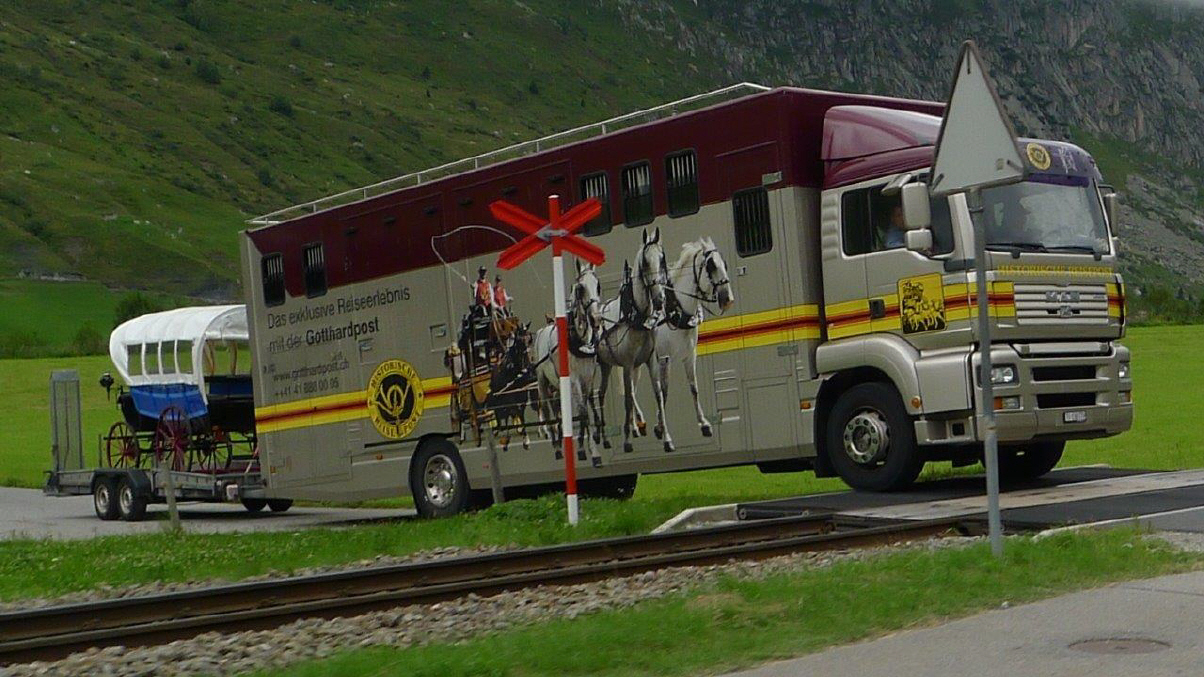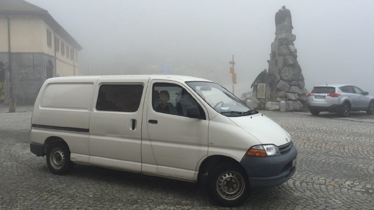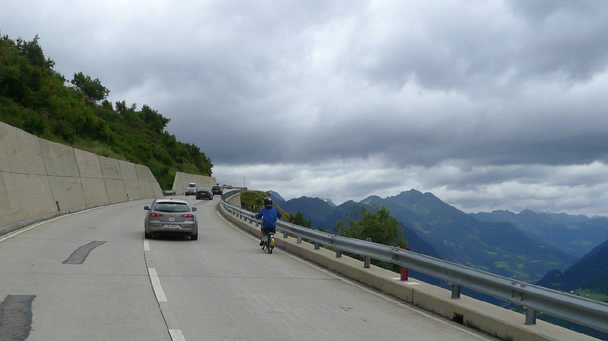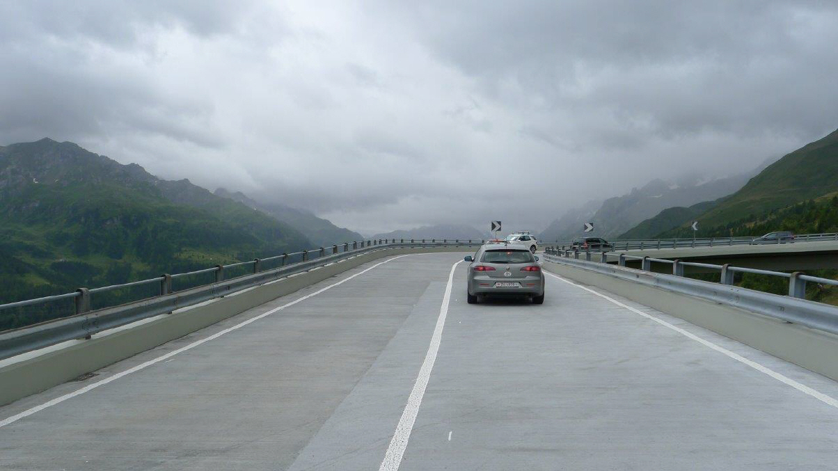 Es ist Rückreisetag für viele, so entschliessen wir uns am 7-8 Kilometer-langen Autobahn-Stau über die Normalstrasse vorbei und die Gotthard-Route zu fahren. Lieber eine Stunde mehr fahren (wenn überhaupt!) und etwas erleben, als im Stau die Kupplung verheizen. Und, siehe da, auch der «Möfi»-Fahrer fehlt nicht, und das bei etwa 4 Grad und in kurzen Hosen! Na ja, im Tessin ist's ja meistens schön warm, nur der Gotthard-Pass liegt halt oft im Nebel und in der Kälte und auf der Passhöhe kratzten wir an der Null-Grad-Grenze bei heftigen Windböen ...