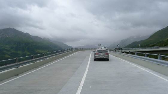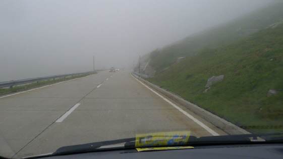 Es ist so etwas von un-wirtlich hier oben: Wir machen einen ganz kurzen Bilder-Halt, um uns dann gleich wieder in den Verkehr einzufädeln, aus Erfahrung wird's mit jeden Hundert Höhenmetern wieder angenehmer, wärmer! Zum Glück sitzen wir im (heiss, à la Ascona!) beheizten Auto und haben mit allen Töff-Fahrern, die unterwegs sind, Erbarmen ... |