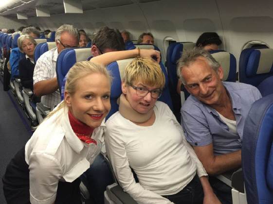 Also geschah es: Kaum zurück, reservierte sie die Flüge, am 19.Nov. mit Edelweiss hinzufliegen, um am 10.Dez, zurückzukehren. Dieser Rückflug wurde dann etwas ganz besonderes. Wie Sigrid in diesem Jahr, feierte eine liebe Freundin von ihr, Silvia Bruno am 29.April in Volketswil ihren «50.Geburtstag». Da Sigrid im Rollstuhl vorzeitig ins Flugzeug gebracht wurde, standen wir zusammen mit 2 anderen Rollstuhl-Fahrern vor dem Einstieg, als uns eine der Airhostessen freudig begrüsste: Wir waren ganz paff, und im Gegensatz zu Sigrid, die die Situation sofort erkannte, musste ich erst in meinem Memory klauben: Natürlich, Nancy, die Tochter Silvias, hatte mit ihrem Bruder die Geburtstagsgesellschaft mit einem Scetch über Mamas Leben unterhalten. Wie haben wir an dem Abend gelacht! Und Siggi hat noch fleissig getanzt, WAHNSINN dieser Zufall! Eigenlich hätte Nancy einen Langstreckenflug nach Florida eingeteilt gehabt, da wurde sie kurzfristig umgeleitet. Auch für sie war es die letzte Begegnung mit Siggi! |
