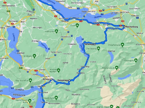 Dort verabschiedeten wir uns von Urs, wir folgten weiteren Kurven über Schwyz, Ibergeregg, Sihlsee, Sattelegg – nach Siebnen fuhren wir zur Autobahn bei Reichenburg, wo jeder seinen Heimweg antrat. Für mich war die Gesamtstrecke 684 km, 11 Pässe. |
