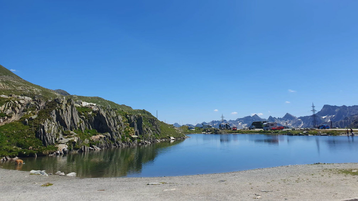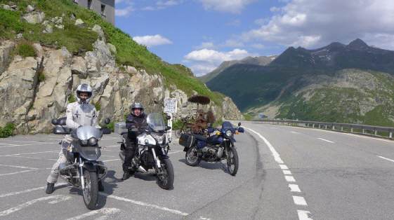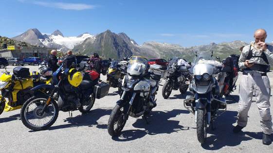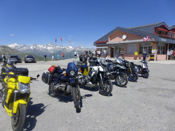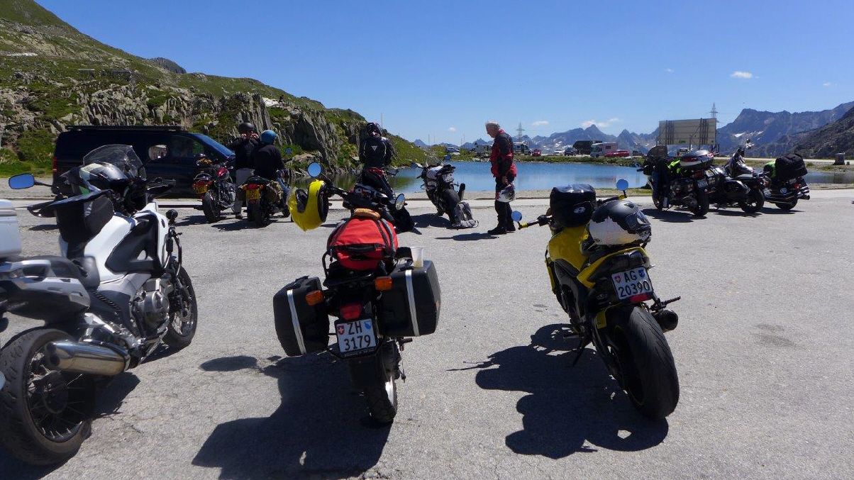 Drei Viertelstunden reichten für das Frühstück, dann begleitete uns Ionut noch bis Stalden, ab da führte uns Urs bis nach Giswil. Die Brünigroute war total überlastet – wie immer – und so waren wir froh, wieder nach Meiringen abbiegen zu können. Wir waren nicht die einzigen, auch in Richtung Grimsel war recht viel Verkehr unterwegs, doch da verteilt es sich gut. Auf der Passhöhe warteten wir jeweils, bis wieder alle zusammen waren, ebenso in Ulrichen, beim Abzweig zum Nufenen: So konnte jeder sein Tempo nehmen, wie er sich wohlfühlt, auch die Überholmanöver zwischen Gletsch bis Obergoms waren nicht leicht, hatte es doch hier vom Furka- und Grimselpass her viele Fahrzeuge, darunter auch Wohnmobils, die unterwegs waren. Ab Ulrichen hatte es dann wieder wenig Verkehr, ist der Nufenen (2478 m ü.M.) doch ein sehr abgelegener Pass mit langer Winterpause. Hier trifft man auf ein sehr internationales Publikum, viele kommen von der Tessinerseite. Wir trafen auf Engländer, die zum ersten Mal auf diesem Pass standen und von der Kulisse unendlich beeindruckt waren. Wir legten nach zweieinhalb Stunden Fahrzeit unsere erste Fahrpause ein.