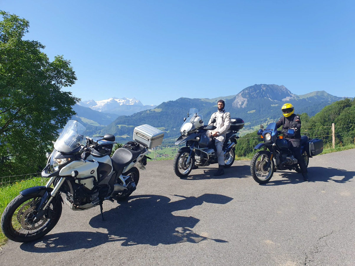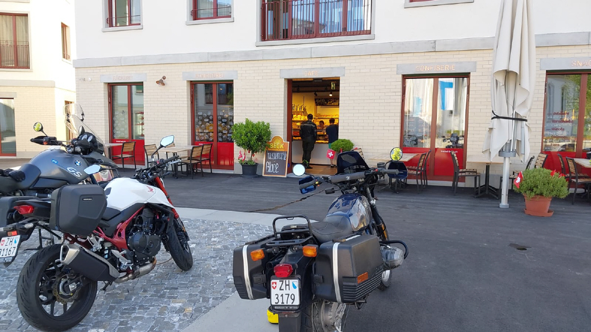 Treffpunkt war der Parkplatz auf der Waldegg um 7.00 Uhr, dazu musste ich vor dem Sonnenaufgang (um 05.59 h) aufstehen. Ebenfalls hatte sich Ionut gemeldet, jedoch nur für die Fahrt bis zum Treffpunkt 2. Geplant war dort um 08.30 Uhr einzutreffen, mit Baustellenlicht und (Billigst-) Tankstelle wurde es dann 08.40 Uhr, als wir be+im Café auf Urs trafen. Er hatte sich die Fahrt offen gelassen und kam unangemeldet: Kein Problem! Mit den 160'000 km auf seiner Crosstourer gehört er zu den sehr routinierten Fahrern. Da steht Gregor noch am Anfang einer grossen Karriere … :) Mit der Tagesleistung von 1100 km zurück aus Polen war er aber für unseren Marathon qualifiziert.