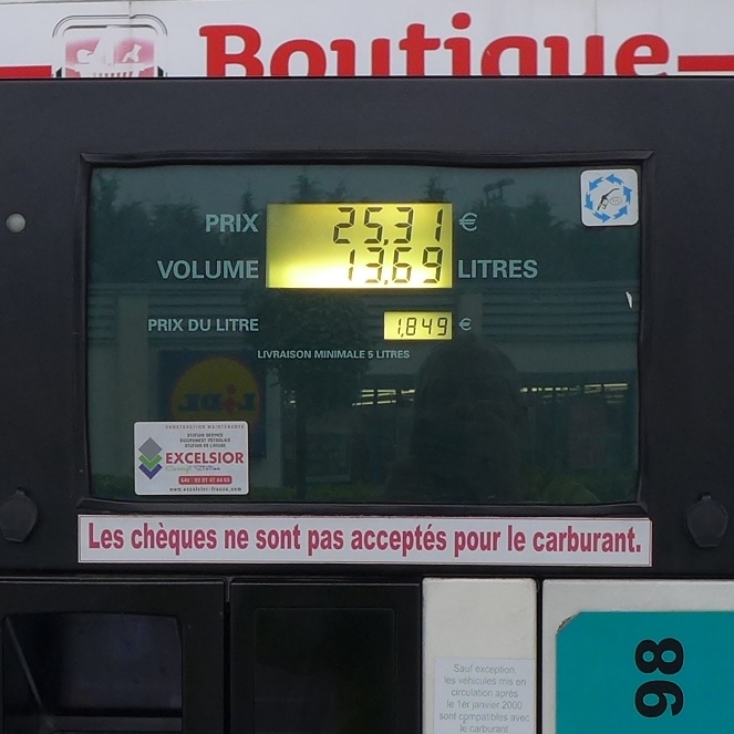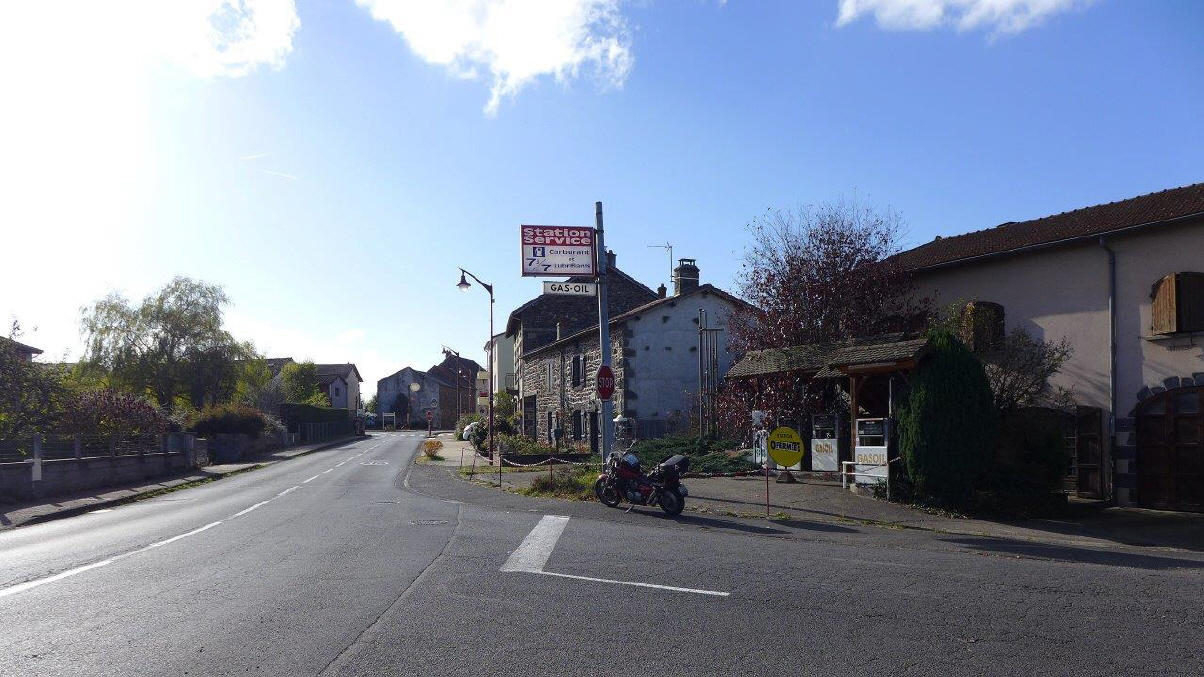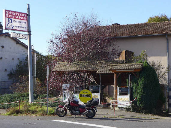 Eigentlich war ich auf der Suche nach einer Pause. Von weitem sah es aus wie eine Tankstelle, als ich näher kam, sah ich dann das «Fermée»-Schild. 7j/7 - ja, das war wahrscheinlich vor langer Zeit. Eine Tankstelle wie in der «guten alten Zeit», nur die Natur hatte sie inzwischen grösstenteils übernommen. Im Serviceraum, ebenfalls mit einem Schild einer Öl-Firma versehen, standen Gestelle drin mit Honig- und Confitüre-Gläser mit Bio-Signet. Wahrscheinlich aus Grand-Pa's Hobby und Grand-mère's Küche!
