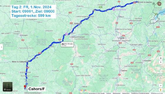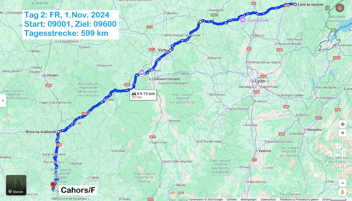 Zur Streckenwahl: Ich gab bei Google maps den Start und das Ziel ein, mit der Option «Keine Autobahn» sowie «Keine Mautstrassen». Zwei Strecken wurden vorgeschlagen: Eine mehr östlich über das Rhone-Tal sowie eine mehr westlich quasi durch Zentral-Frankreich. Da ich schon mehrmals mit Töff und Auto auf Nebenstrassen durch das Rhonetal gefahren bin, zu unterschiedlichen Jahreszeiten, entschied ich mich für die andere Strecke. |
