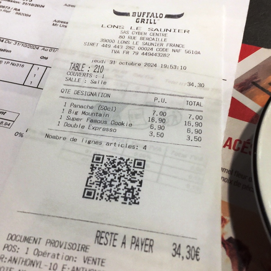 Die weitere Strecke führte über Pontarlier, nach dem Passieren der Grenze bei Les Verrières schaffte ich nur noch knapp 100 km. Die nächst grössere Stadt nach Champagnole war Lons-le-Saunier, welche ich wieder im Nebel und bei hereinbrechender Dunkelheit erreichte. An einer Tankstelle wurde mir der Weg aufgezeigt, denn da es am nächsten Tag in Frankreich ein Feiertag war, musste ich bei einem grösseren Hotel, einem Ibis Budget, andocken. Das Buffolo Bill-Restaurant gleich daneben war dann meine nächste Rettung. Viele Familien, in Anbetracht des Feiertags, gingen hier auswärts essen, entsprechend laut war es da. |