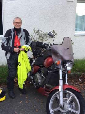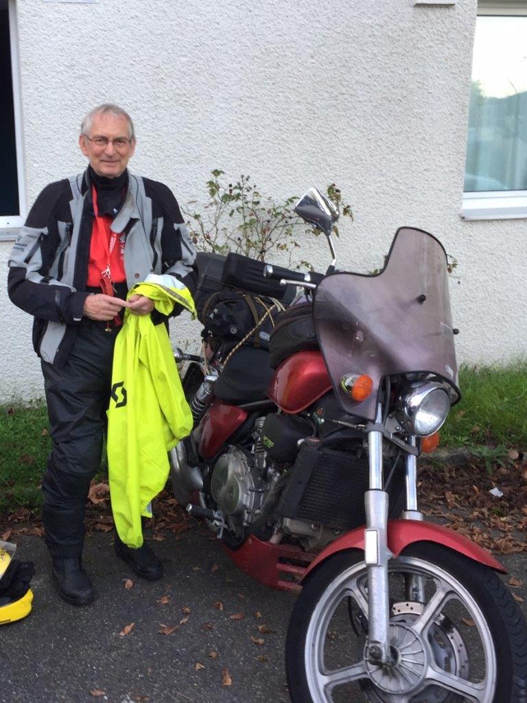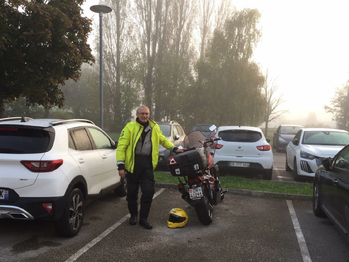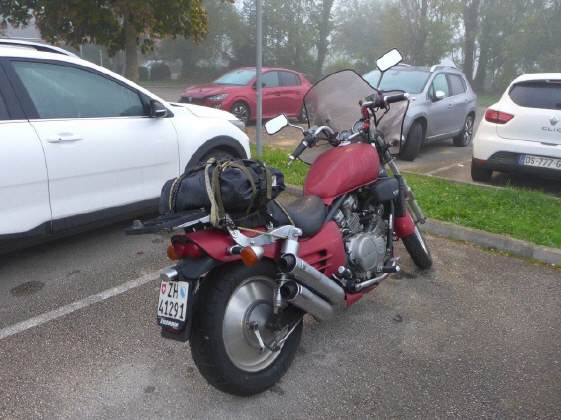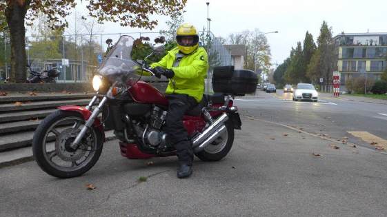 Draussen war es kalt und neblig, alles war nass - das Windschild und die Autoscheiben beschlagen. Volle Montur, Regenkombi als Kälte- und Nässeschutz, war angesagt.