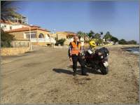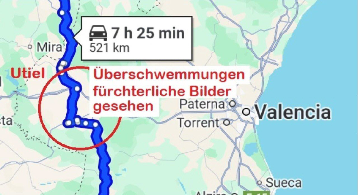 In Spanien angekommen, erwartete mich bewölktes, aber nicht allzu kaltes Wetter: Gegen den Abend wurde es dann noch nass, zwar nur für eine halbe Stunde, dafür aber heftig! Ich wusste aber nicht, was sich im südlicheren Teil abspielte, das erlebte ich dann erst am nächsten Tag. Es waren die riesigen Überschwemmungen im Hinterland von València, die mich zu Umwegen zwang. Als ich dann trotzdem mitten drin landete, wies mir ein Feuerwehrmann den Weg, der aber nur mit dem Töff möglich war, so quasi zwischen den Beinen der allgegenwärtigen Helfer. |