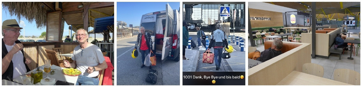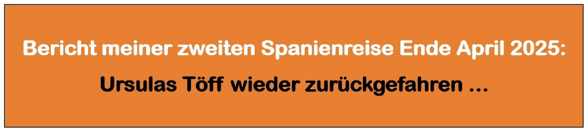 Mit dem Flugzeug flog ich am Montag, 28.April über Madrid nach Almeria. Mein Flugzeug landete um 13.15 Uhr. Dass in Spanien an diesem Tag seit 12.30 Uhr ein kompletter Blackout und Ausfall des Internet und Handy-Verkehrs herrschte, vernahm ich erst im Verlauf des Nachmittags auf dem Weg nach Fernán Pérez. Quer durch die Stadt halfen mir verschiedene Buschauffeure, dann strandete ich am Ostrand der Stadt Almeria bei einem Spital, von wo aus eine Überlandlinie den Zielort erreichen sollte. Ich wartete bestimmt eine Stunde, ohne dass ein Bus dieser Nummer eintraf. Als ein Taxifahrer seine Fahrgäste entlud, fragte ich, ob er mich nach Fernán Pérez fahren könne. Auf seiner Liste schaute er nach und eruierte einen Preis um die 44 €. Unter diesen unsicheren Umständen war ich bereit, so viel auszulegen. Im Ort angekommen, machte ich mich auf die Suche nach dem Töff, übernachtete am Ort und fuhr in zwei Tagen der Mittelmeerküste nach Barcelona zum Hafen. Die Fähre brachte mich in etwa 20 Stunden nach Genua, von dort war es nur noch einen «Katzensprung» nach Hause.