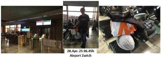 Meine Reise startete frühmorgens in Thalwil, wo ich den Zug bestieg, der mich knapp nach 6 Uhr im Airport eintreffen liess. Ich bin immer wieder erstaunt, wie reibungslos die Sicherheitskontrolle (wo holen sie nur die vielen Personen her, die um diese Zeit schon am Arbeiten sind?) abläuft, aber auch wie alle Passagiere das richtige Gate finden, um ihren Flug zu erwischen! Für mich ist das jedes Mal ein Riesenstress, andere machen das offenbar mit viel Routine. Bei mir ist das Fliegen halt nur eine seltene Angelegenheit geworden, seit ich allein bin.