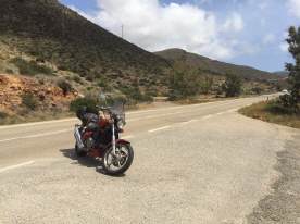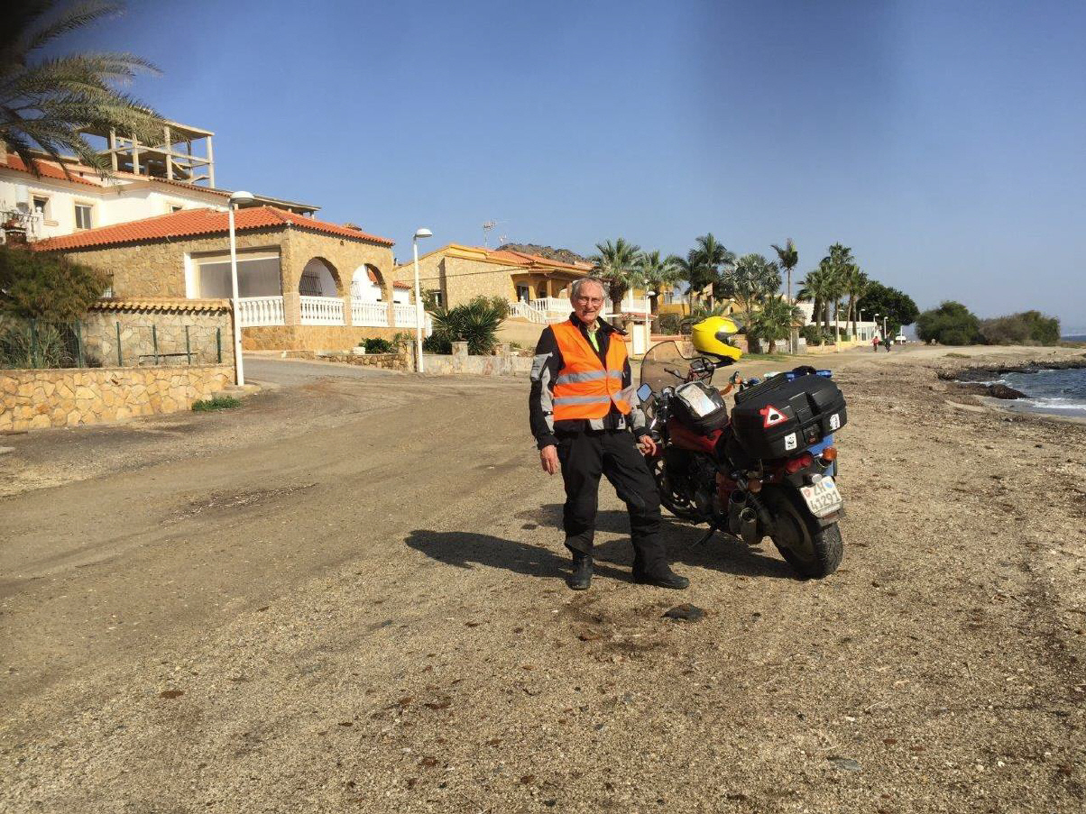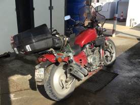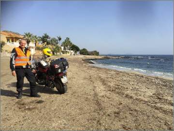 Am letzten Tag musste ich nur noch knapp 200 km zurücklegen, es war der Tag, an welchem ich auf das Meer traf. Ich hatte extra ein Daten-Paket gelöst, damit ich unabhängig Zugang auf WhatsApp oder Google Maps hatte. Durch diverse Regenfälle, aber auch das Überschwemmungsgebiet, war die Maschine gekennzeichnet – klar, dass ich sie sauber überbringen wollte. 5 Tage, 2221 km - die VF750 Custom Magma bei Ursula an ihrem neuen Wohnort Fenan Perez (Nähe Almeria) frisch abgespritzt, das Resultat hat sich gelohnt! Start bei 4 Grad, am Strand bei El Calón (im Bild) um die 25 Grad - doch meine Kleider waren nicht dafür vorgesehen. |