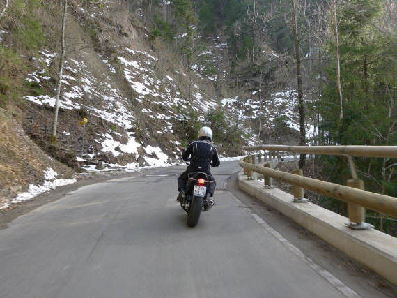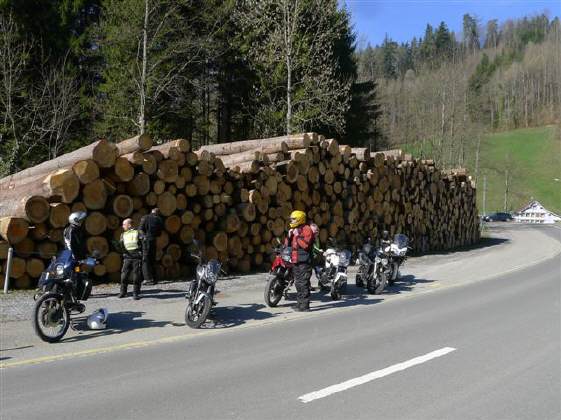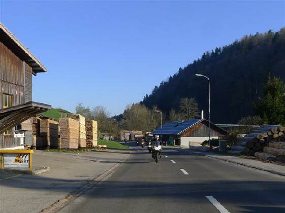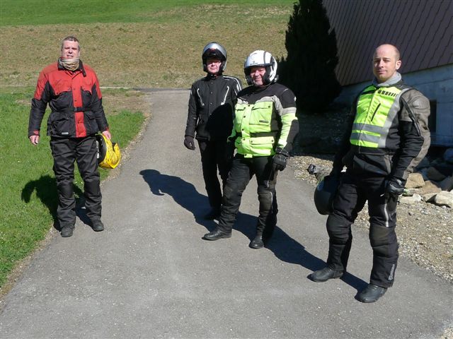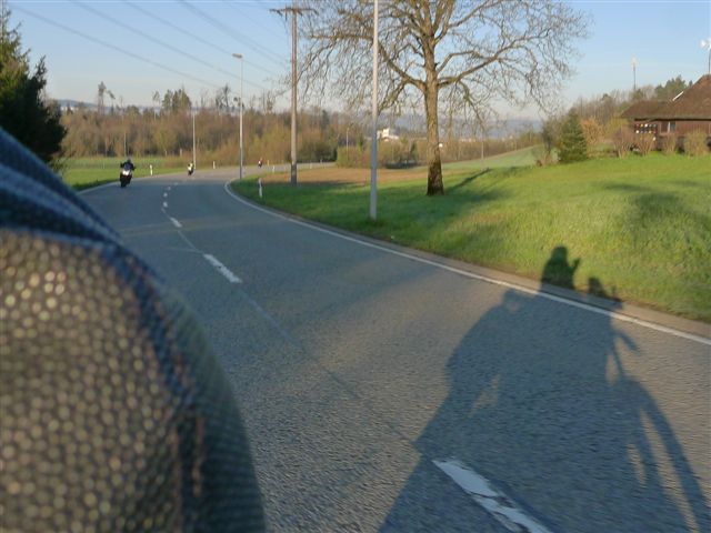 Abgesehen von der Kälte war es ein traumhaft schöner Frühlingstag: Die Sonne stand tief über dem Horizont, in Volketswil hatten wir einen herrlichen Blick auf die Alpenkette und nur in den Wald- und Schattenpartien, wo es ein bisschen feucht hätte sein können, verlangsamten wir unser Tempo. In Turbenthal legte ich einen Zwischenhalt ein, um mich nach der Befindlichkeit zu erkundigen. Silvio, der seine normalen Sommerhandschuhe trug, litt gewaltig. So stöberte ich in meinem Fundus ( ... es ist die Erfahrung die zählt!) und wurde fündig in einem wärmeren Paar Winterhandschuhe - die gab er erst nachmittags etwa um 15 Uhr zurück!