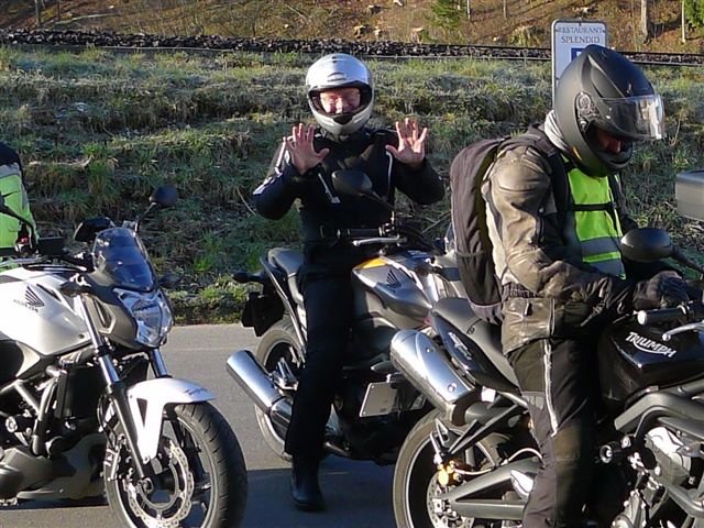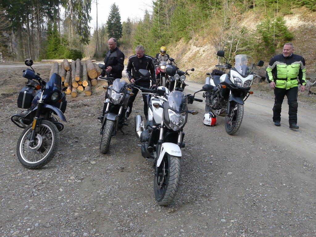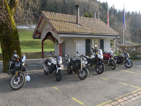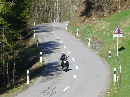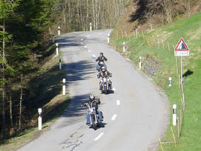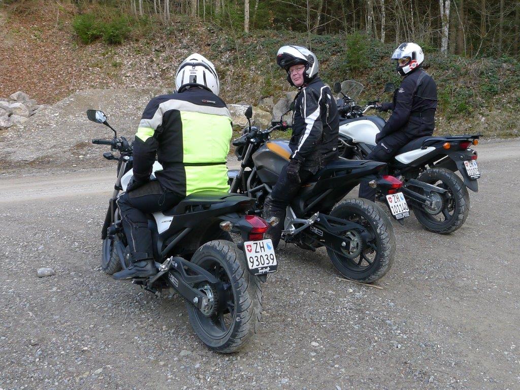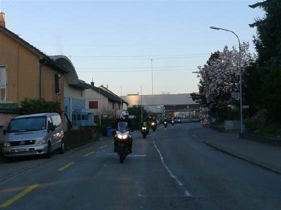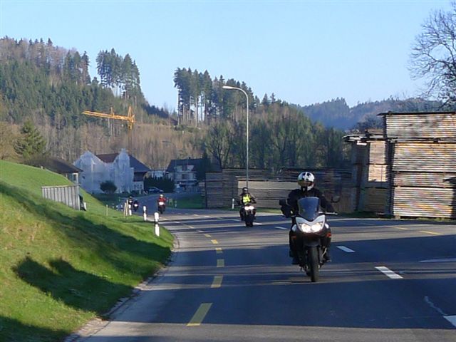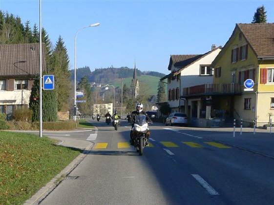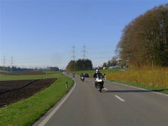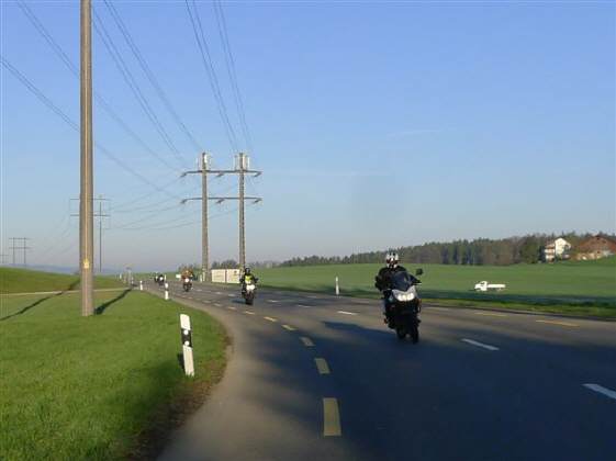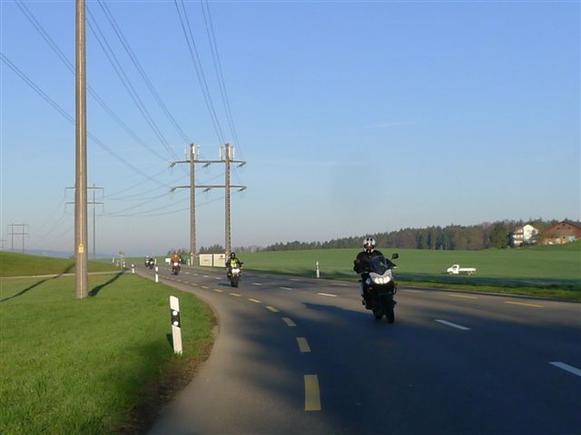 Als nächste Übung war das «Fahren auf Zug» dran. Ich fuhr voraus und konnte so alle Ankömmlinge einzeln beobachten, ob die Spur immer noch stimmt. Zwischen meinen Teilnehmern (an einem Samstag geschieht das eher) war eine Gruppe Töff-Fahrer auf Harleys unterwegs, da konnte man alles sehen - von vorbildlich bis wenig empfehlenswert ...
