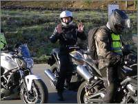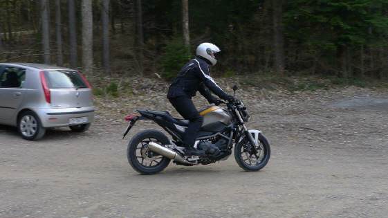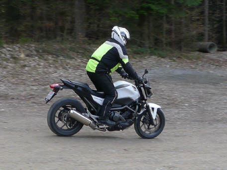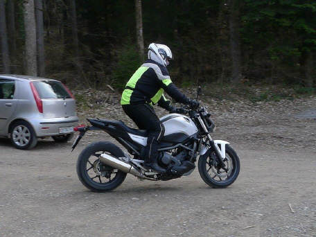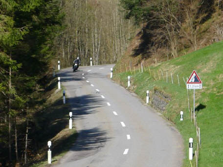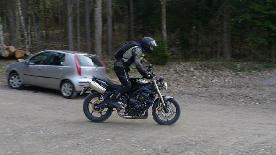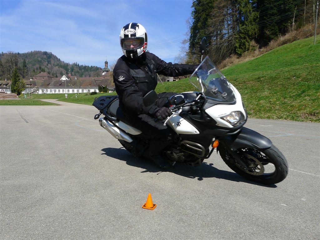 Das nächste Thema war dann die Blicktechnik: Vorausschauende Fahrweise ist das Rezept gegen den «Schreck»! Wer hinter dem Lenker erschrickt, handelt oft unangepasst, was zum Sturz oder Verlassen der Fahrbahn führen kann. Diesem entgegenzuwirken heisst, die Strecke möglichst weit voraus zu beobachten und das Umfeld wahrzunehmen. Vor allem in ländlichen Gegenden, wie hier vorhanden, können sich die Situationen ganz schnell ändern: Verschmutzte Fahrbahn, landwirtschaftliche Fahrzeuge, Wanderer am Strassenrand usw. usf.