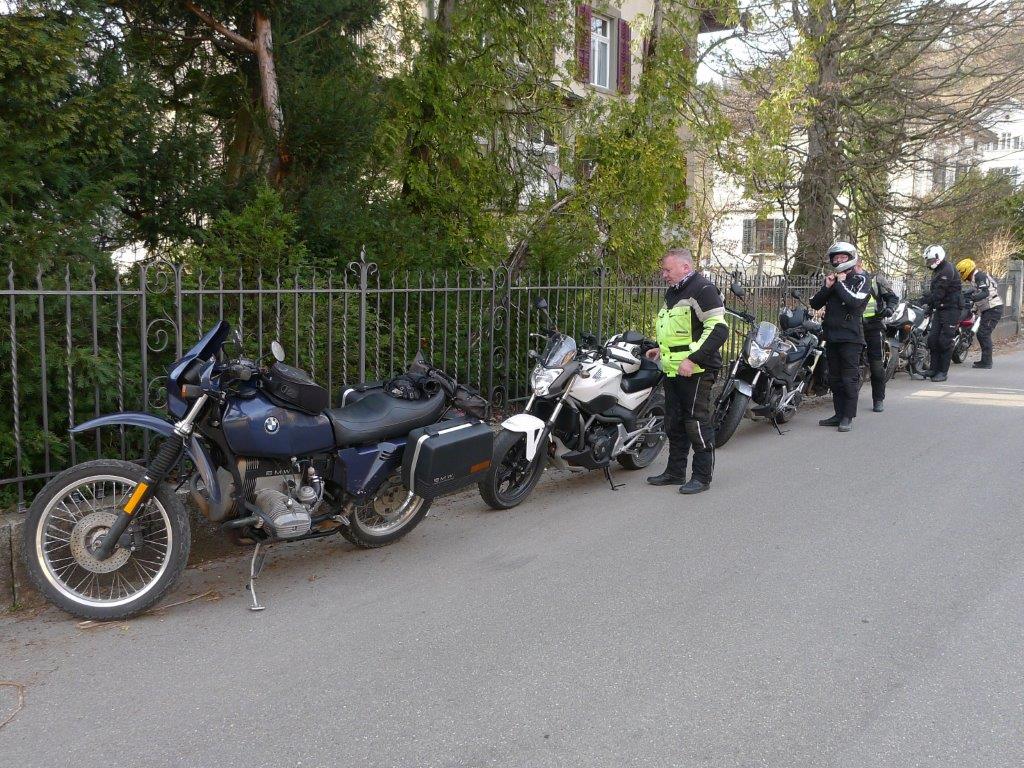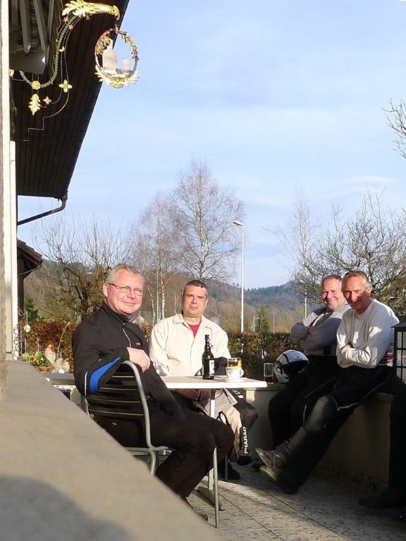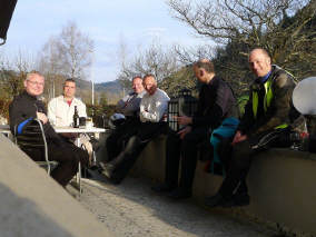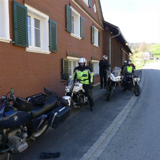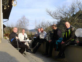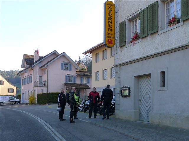 Die Schlussübung, gestartet in Au, geht über Rotbüel, Allewinde nach Sternenberg, wo wir diesmal in Richtung Bauma abzweigten. Es geht darum, eine saubere Kurvenlinie, die Kurven geschwindigkeitsmässig aufbauend zu fahren und bergab vor der Kurve den Bremsvorgang abzuschliessen, nicht in die Kurve hinein oder in der Kurve zu bremsen. Da es Samstag war, schloss das Café Voland bereits um 17 Uhr. Also landeten wir im Rest. Heimat, wo uns die nette Wirtin im Garten Getränke servierte. Da es ja eigentlich noch Wintersaison war, mussten wir uns mit der Mauer als Sitzgelegenheit begnügen. Dies konnte unserer Schlussbesprechung aber keinen Abstrich machen.
