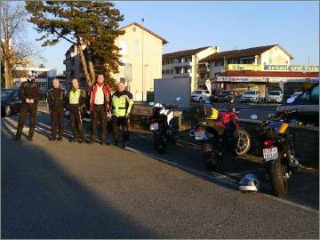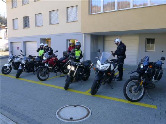 Frisch aufgewärmt (fast eine Stunde!) und verpflegt mit Kaffee und Gipfeli starteten wir zum Kursprogramm. Drei Teilnehmer, die den Kurs repetierten, schlossen sich gleich einmal der «Perlschnur», wie wir die erste Übung Kurvenfahrlinie nennen, an und versuchten, mir möglichst genau in der Wahl der Fahrspur zu folgen, mit stark verlangsamter Fahrgeschwindigkeit. Von Zeit zu Zeit wechselten wir die Fahrposition, so dass jeder bis zum ersten Halt ein Stück hinter mir herfahren durfte.