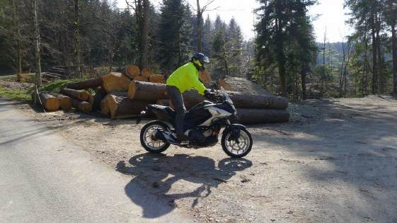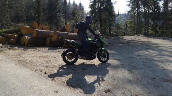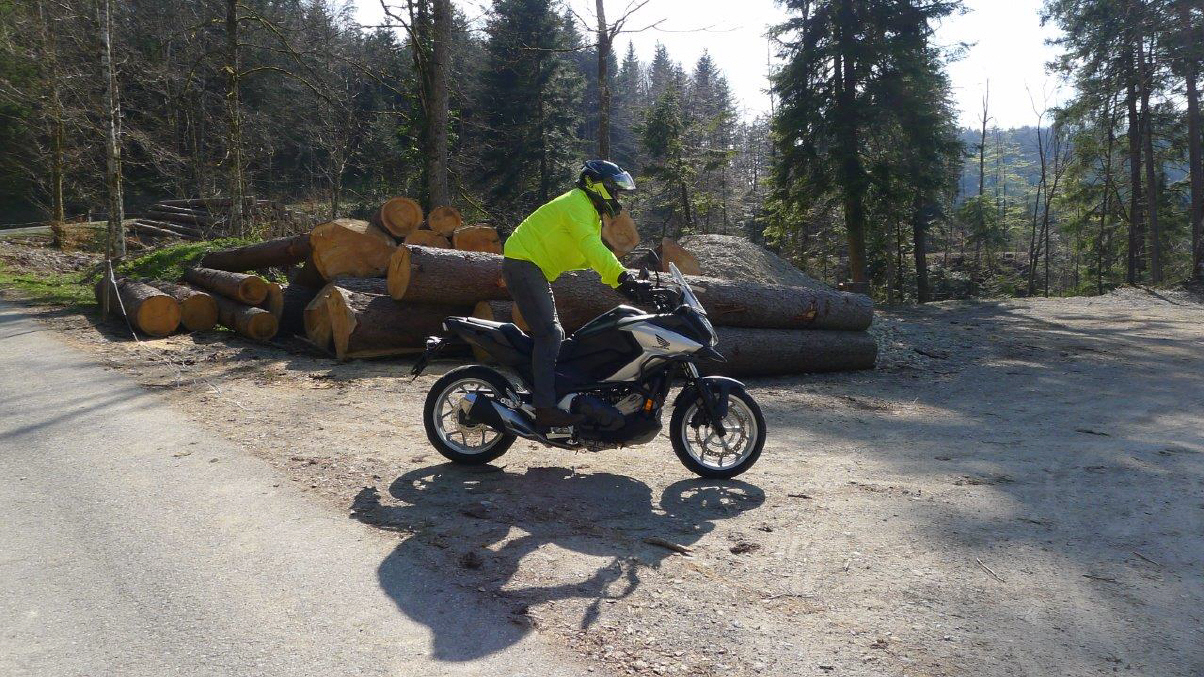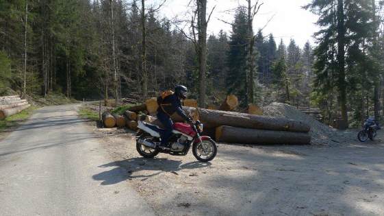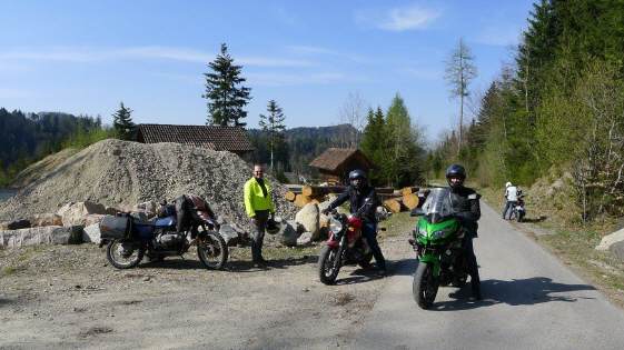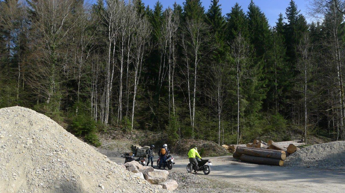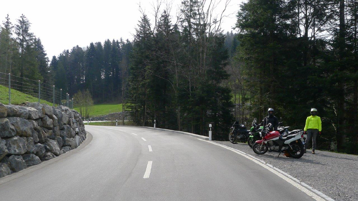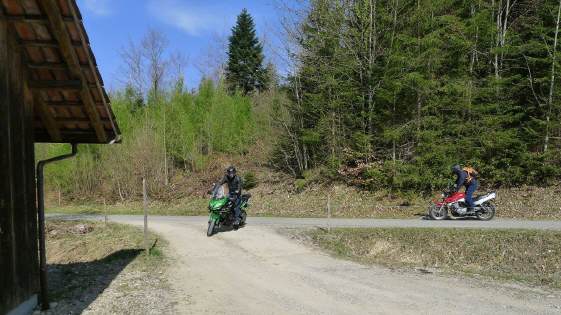 Als wir aus dem Restaurant traten, nieselte es etwas: «Dry rain» nennt dies der Engländer, weil die Strasse nicht richtig nass wird und der Regen auf den Kleidern vom Fahrtwind fortwährend trocknet. Noch einmal war eine Runde angesagt, um mit verschiedenen Lenktechniken zu spielen, bevor wir uns ins Gelände begaben: Flucht ins Gelände war angesagt! Was machen, wenn auf der Strasse kein Platz übrig bleibt? Lieber weg von der Strasse als ein Crash riskieren. |