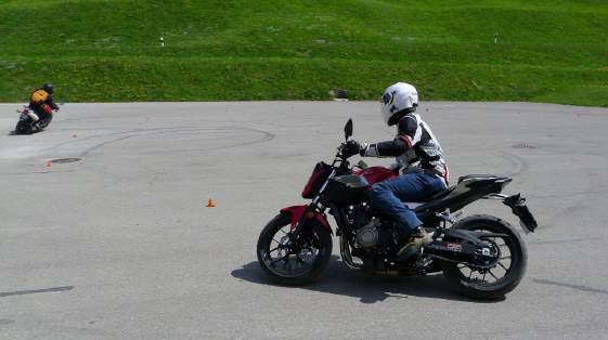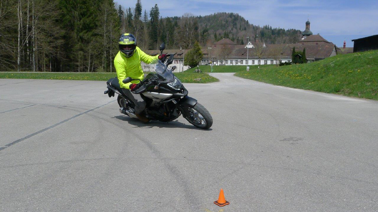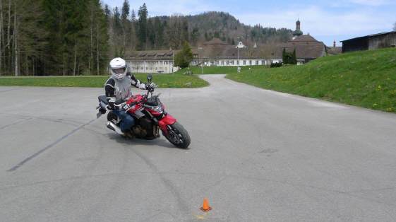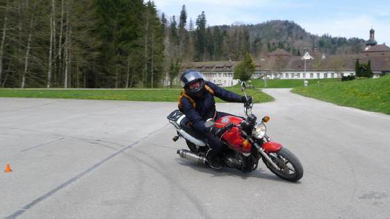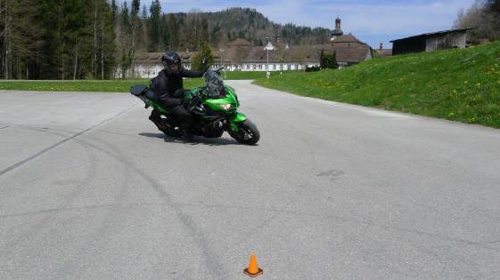 Nach dem Zahlen waren wir dann bereit für das Nachmittagsprogramm, wo wir noch ein bisschen «Motorradfahren» spielen: Das Hauptziel, eine saubere Kurvenlinie, geschwindigkeitsmässig richtig gefahren und wieder am richtigen Ort aus der Kurve heraus gekommen, muss vor dem Mittagessen erreicht werden. So machten wir uns also auf den Weg, noch viel auszuprobieren, ganz am Anfang die Umsetzung der Gegenlenk-Technik. Einmal mehr war der AHA-Effekt gross, aber am vorgesehenen richtigen Platz.