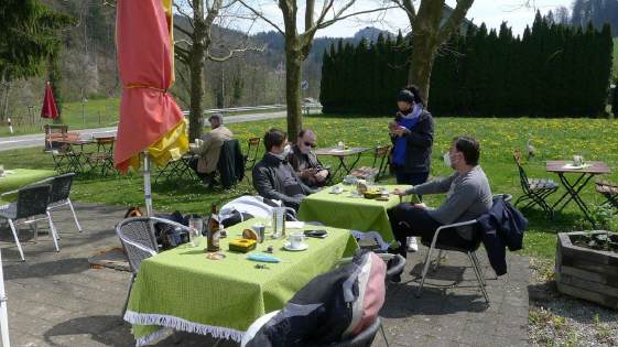 Da der Wirt des «Sternens», Roman Mahler, inzwischen eine neue Arbeitsstelle angetreten hatte, mussten wir ins benachbarte Wirtshaus zum Scheidweg auf dem Weg von Dussnang nach Fischingen ausweichen. Das Wetter erlaubte uns in der Gartenwirtschaft Platz zu nehmen und, so direkt an der Sonne, liess es sich gut aushalten. Wir wurden sehr freundlich bedient und auch das Essen war gut und preiswert. Danach aber mussten wir zurück in den Sternen für den zweiten Theorie-Teil.