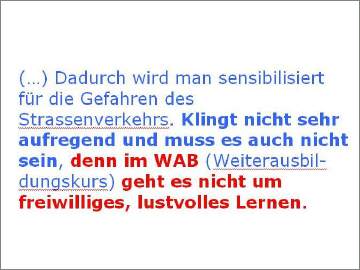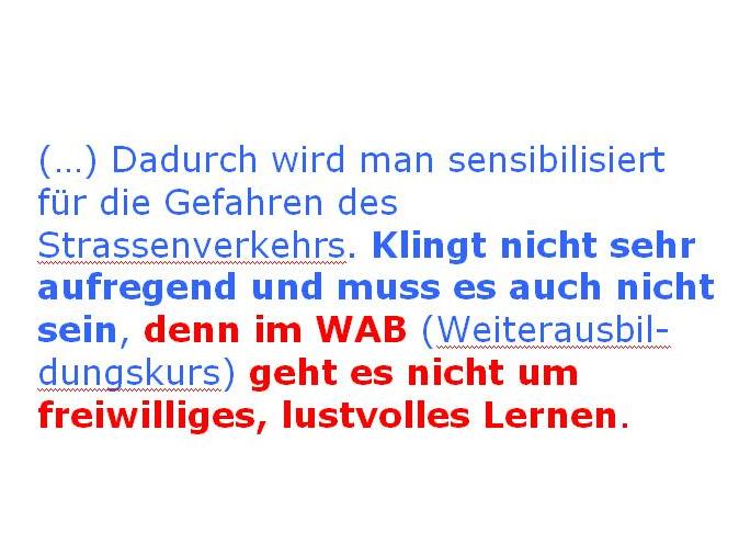WAB ist obligatorisch! «Und, wie hat sich das angefühlt, was sind deine Eindrücke?» An einem WAB-Kurs doziert der Leiter nicht, er regt die Teilnehmenden zum Nachdenken und zum Gedankenaustausch an. Dadurch wird man sensibilisiert für die Gefahren des Strassenverkehrs. Klingt nicht sehr aufregend und muss es auch nicht sein, denn im WAB (Weiterausbildungskurs) geht es nicht um freiwilliges, lustvolles Lernen. |