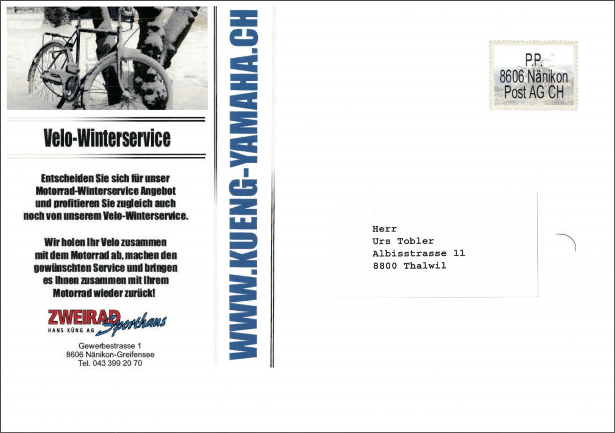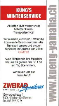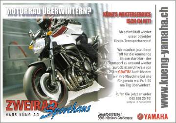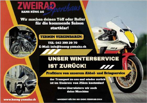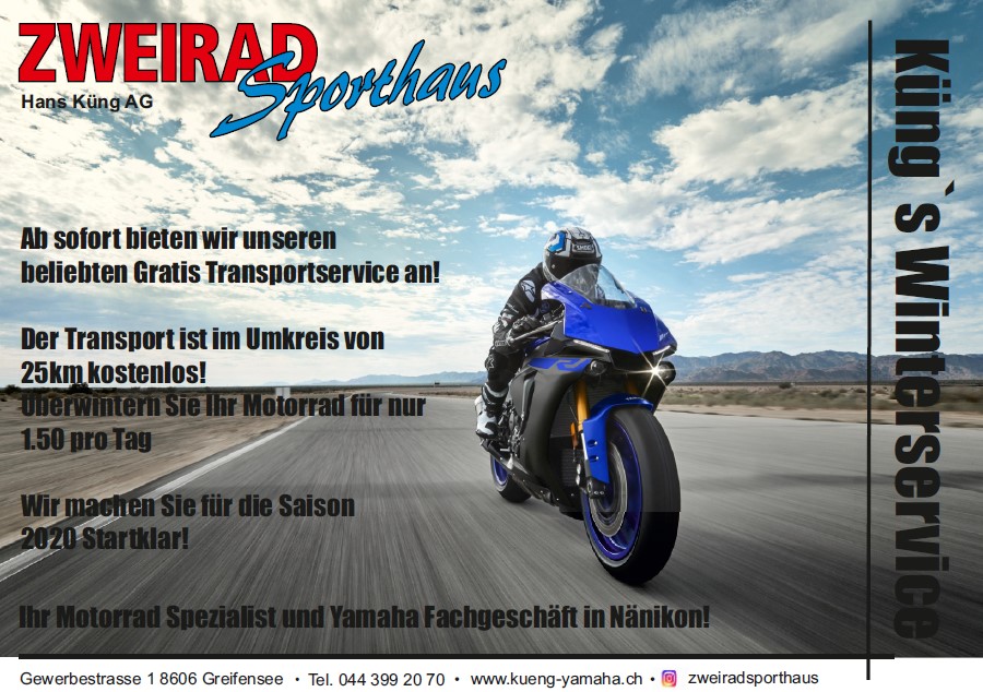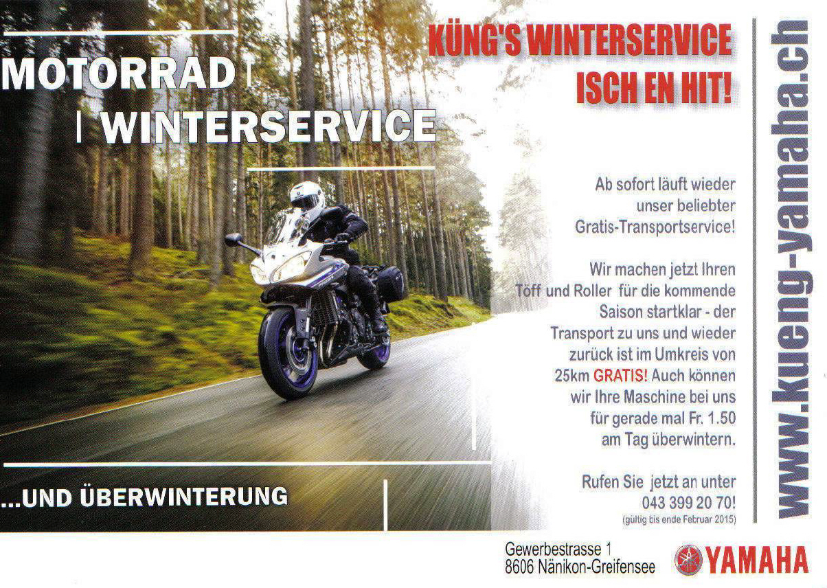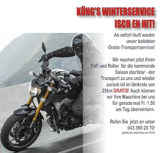 Wer seinen Töff beim Fachmann für die Winterpause in Obhut geben will, hat verschiedene Angebote, wie z.B. HIER BEI ZWEIRAD-SPORTHAUS KÜNG, Angebot als PDF [242 KB]