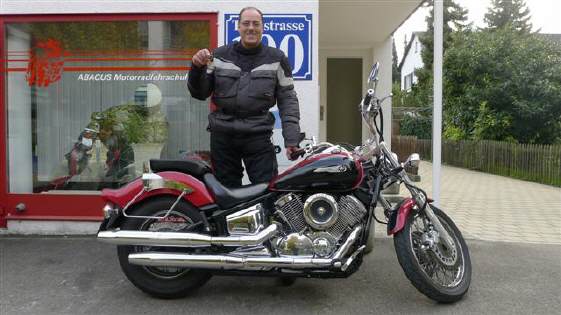 Bei Küng Yamaha in Nänikon-Greifensee wurde ich fündig: Der Mech von Hans Küng, Thomas Matusik, hatte privat eine XVS 1100 und mietete sie während vieler Jahre günstig an meine Fahrschüler. Meistens war das eine Miete von 5-8 Tagen, während derer meine Fahrschüler mit mir 1-2 Doppellektionen und anschliessend ihre (positive!) Prüfung absolvierten. Da die Fahrschüler nur ihre normalen Alltagskilometer und ein bisschen Parkplatzübungen absolvierten, machte ihnen Thomas einen entsprechend günstigen Tagessatz. Es passierte nie etwas mit seiner Maschine und alle kamen immer das erste Mal durch - bis heute! (Stand: 7.11.2011) |