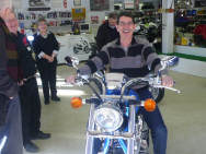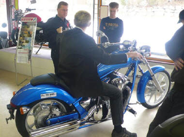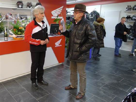 Die ehemaligen Geschäftsräumlichkeiten von Peier & Utzinger wurden auf diesen Zeitpunkt hin neu gestaltet: Der Ladenraum zeigt sich im neuen Honda-Design, in schönem und trendigem Look! Die Farben der Einrichtung sind in weiss, kombiniert mit dem Honda-Rot. Ein schöner dunkler Steinbodenbelag lässt die darauf stehenden Maschinen je nach Lichtverhältnissen spiegeln. In einer Nische hat es eine adrett gestalte Umziehkabine, um Kleider zur Probe anzulegen. Es ist eine toll gestaltete Umgebung und wir wünschen Roger und Silvia Lasta (vormals «Heidelberger-Motos» in Schöfflisdorf) einen guten Start ins neue Geschäft! Ebenfalls trafen wir den scheidenden Fritz Peier mit seiner Frau Ursula «Uke» an und ich überreichte Fritz zum Abschied ein Geschenk für seinen Neustart in den (Un-) Ruhestand. In seinem Bauernhaus hat er grosse Kellerräume, wo er bestimmt mit seinem Sohn und seinem Bruder ab und zu «am Schrauben» anzutreffen sein wird, denn nach der langen Tätigkeit wird er weder das Selbstfahren noch den Schraubenschlüssel so schnell weglegen können. Alles Gute, Fritz und noch eine gute Gesundheit, dass Du all Deine Pläne nicht nur schmieden, sondern auch noch ausführen kannst. Im Bild unten: Links der neue Chef Roger mit Kundschaft, rechts hinten: Fritz Peier, der nach 28 Jahren zurücktritt. |