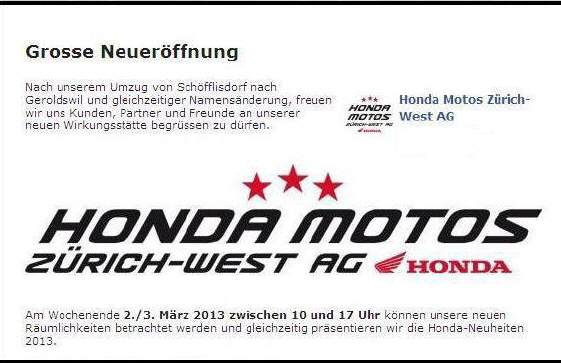 Neueröffnung: Honda Motos Zürich-West Geroldswil |