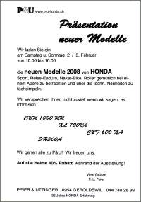 Am kommenden Samstag und Sonntag, 2. und 3. Febr. lädt Fritz Peier, exclusiv-Honda-Händler in Geroldswil zu einer Ausstellung ein: Er zeigt die neusten Modelle von Honda, die danach an der SWISS-MOTO erstmals dem Publikum gezeigt werden. Fritz Peier betreut meine grossen Honda-Maschinen, auch meine Renn-CBR 600, die er jeweils bei entsprechender Gelegenheit für die Piste herrichtet. Ich werde sowohl samstags wie auch sonntags von 10-16 Uhr anwesend sein. Dabei erteile ich Auskunft über die Fahrschule, usw.
